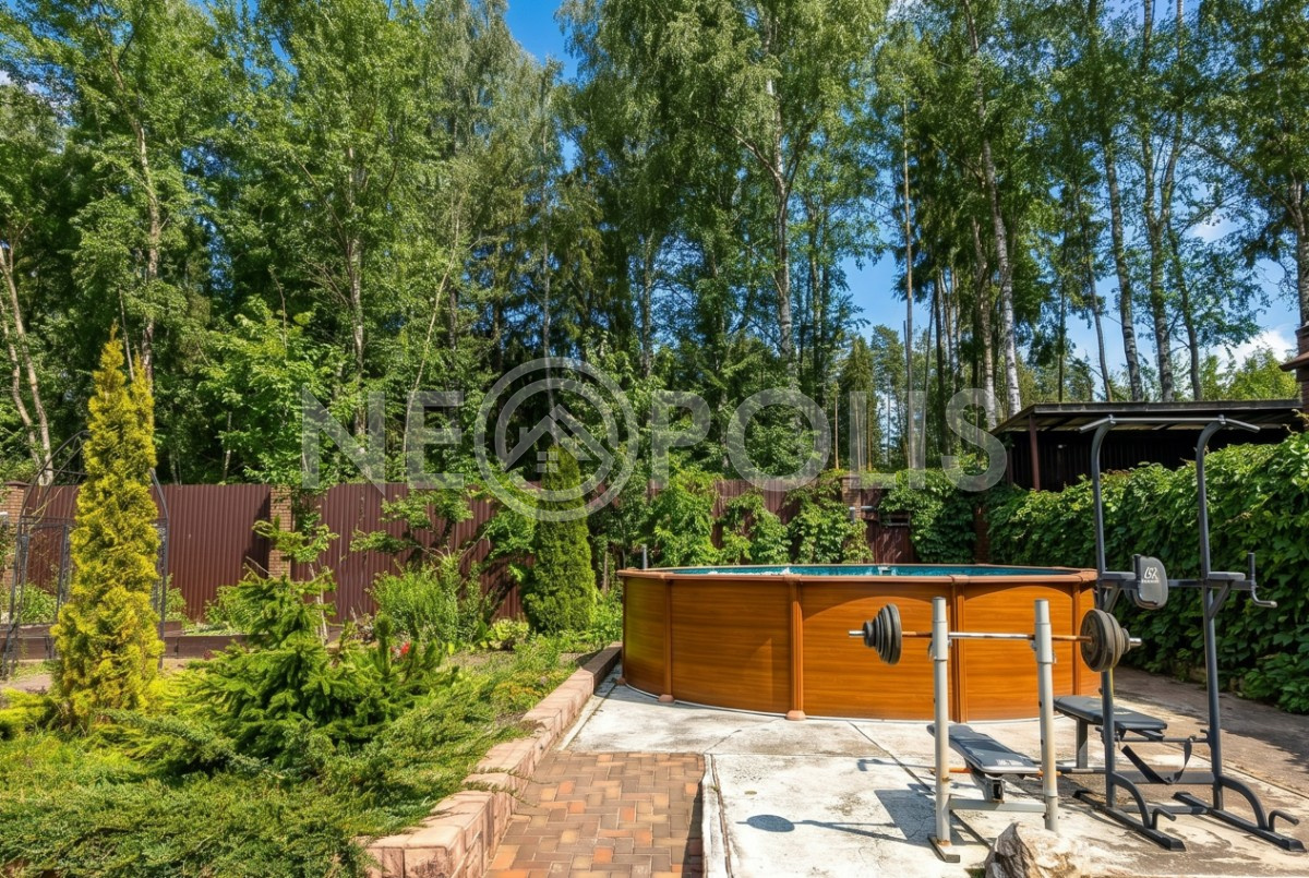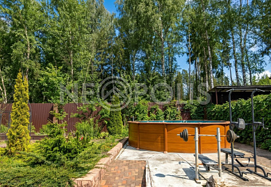 - На участке есть кованая открытая беседка, бассейн, грядки.