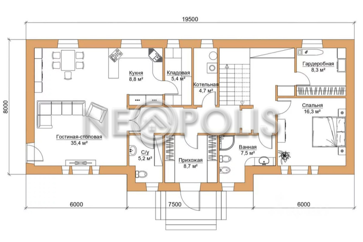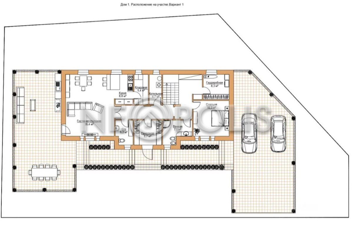 - 1 этаж:прихожая, холл, кухня-столовая с кладовой, гостиная с выходом на террасу, мастер спальня с ванной комнатой и гардеробной, кабинет, санузел, постирочная, котельная.