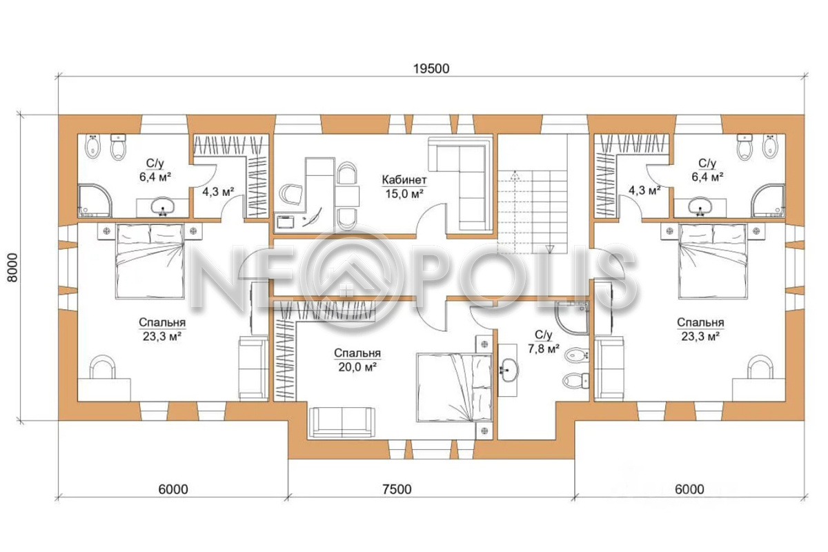 - 2 этаж:холл, 3 спальни, 2 санузла.
