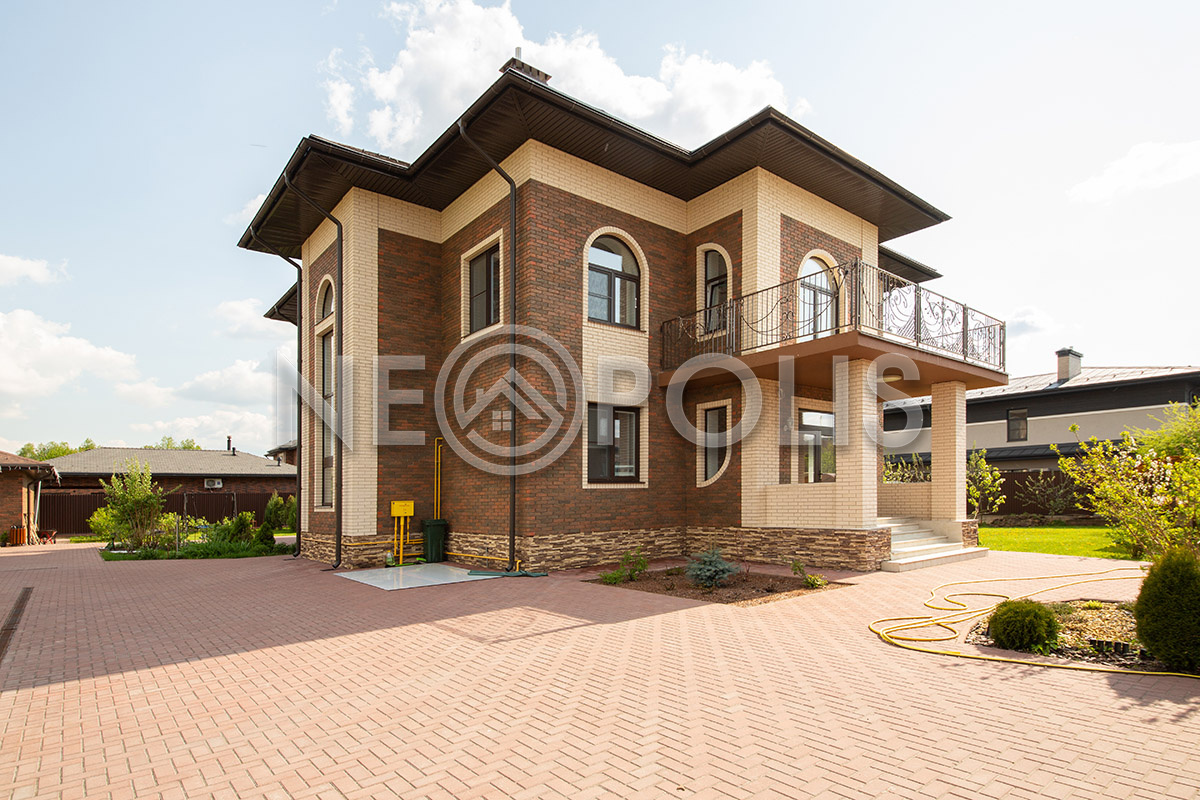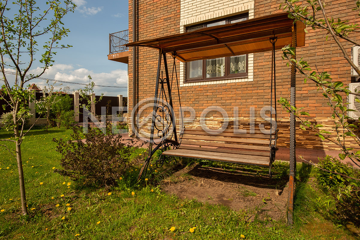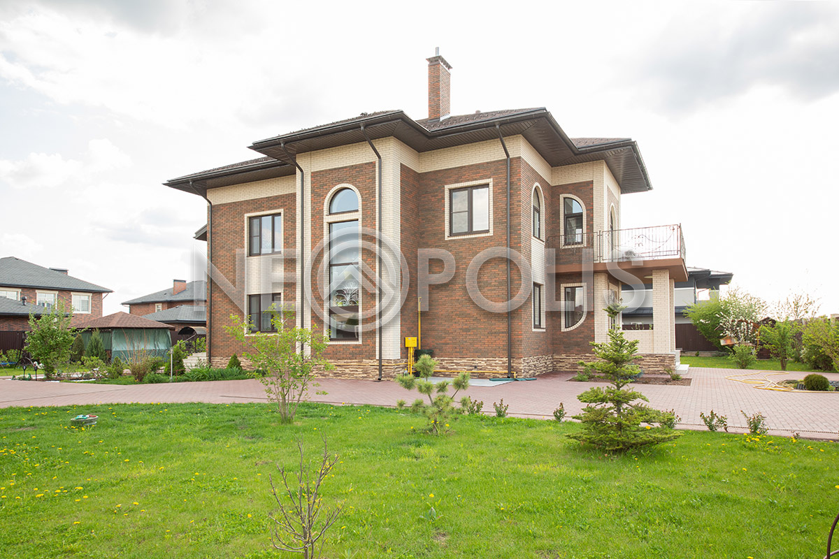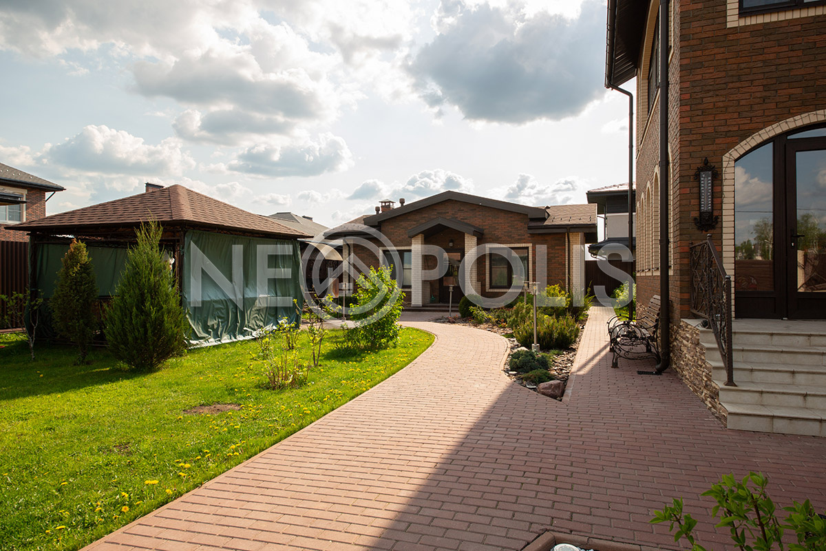 На участке выполнен дренаж, дорожки вымощены брусчаткой, разведено уличное освещение.