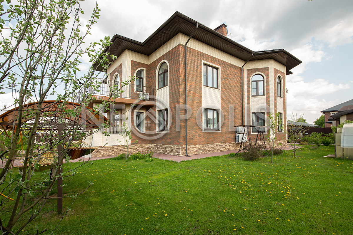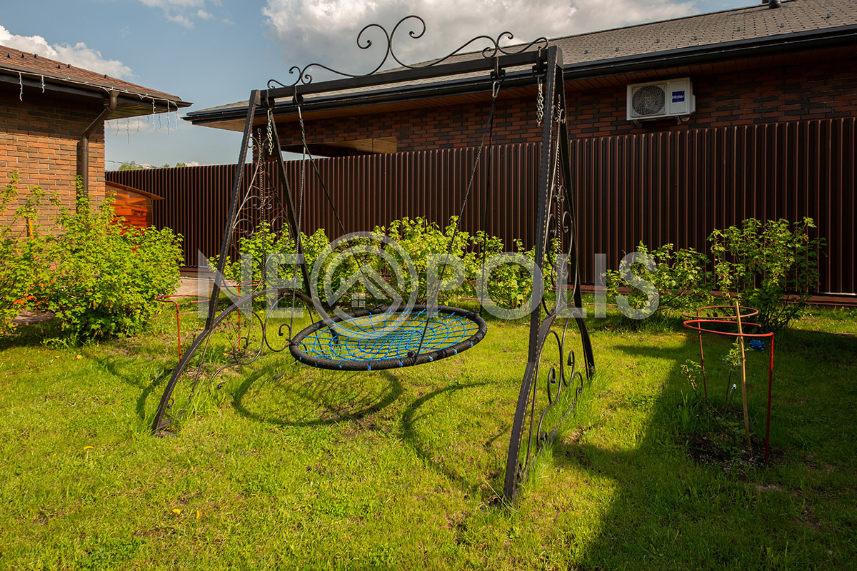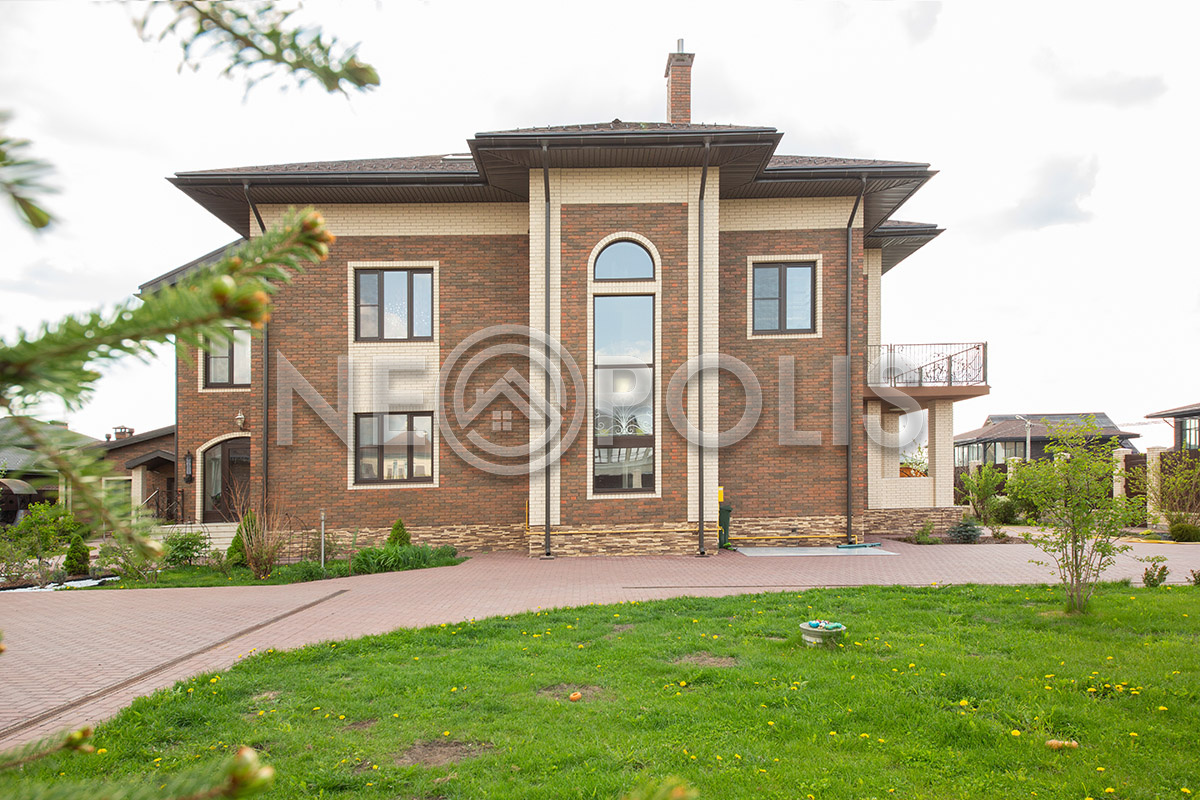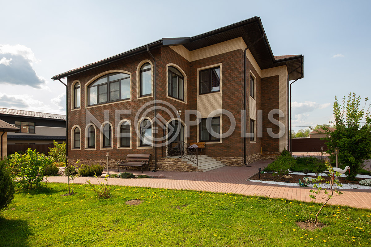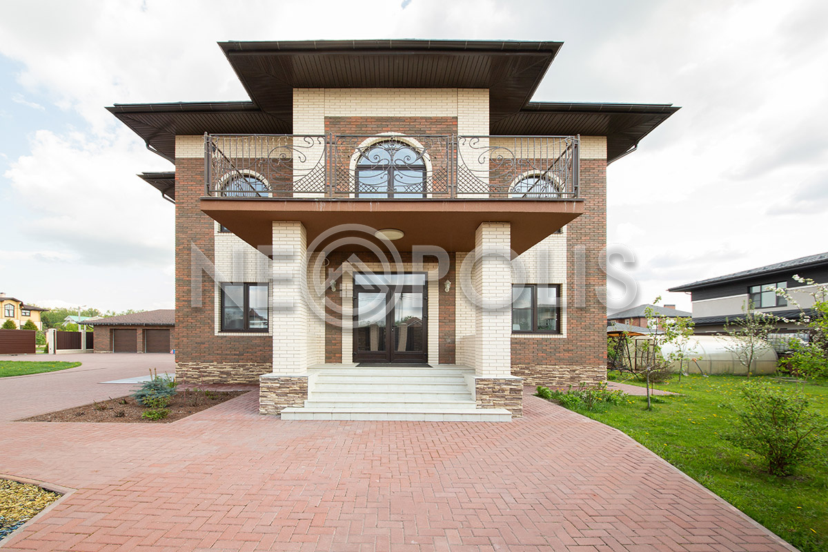 На участке выполнен дренаж, дорожки вымощены брусчаткой, разведено уличное освещение.
