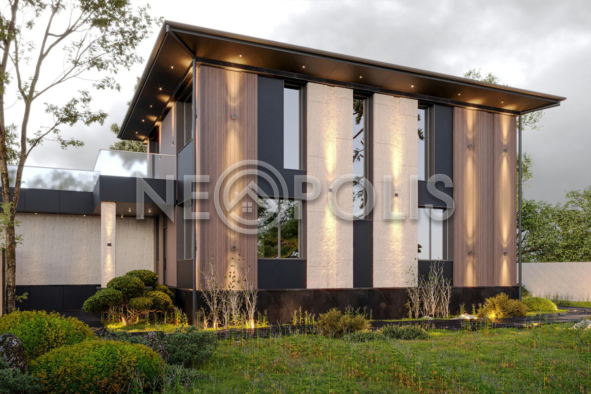 - 1 этаж:холл, кухня-столовая, гостиная с выходом на террасу, спальня, гардеробная, санузел, котельная.