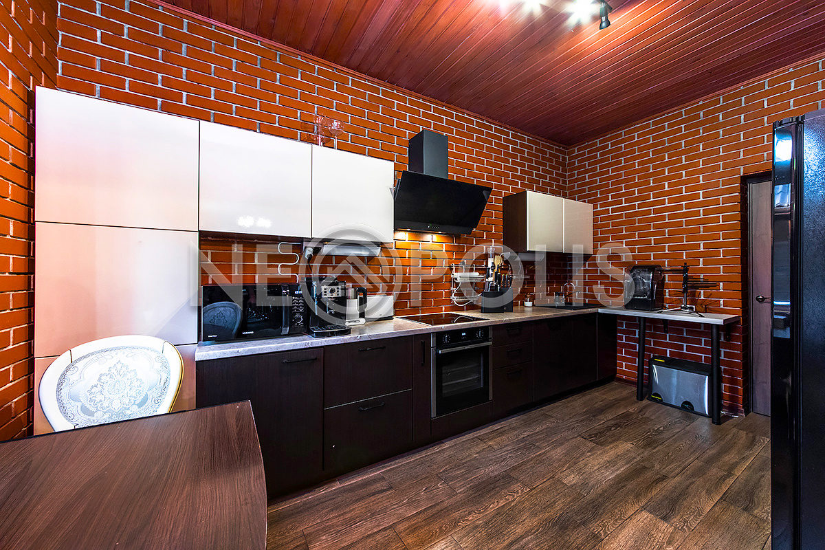 - Материал стен монолитная плита, фасад облицован белым клинкерным кирпичом, внутренняя отделка стен: обои, крашенная декоративная штукатурка, искусственный камень