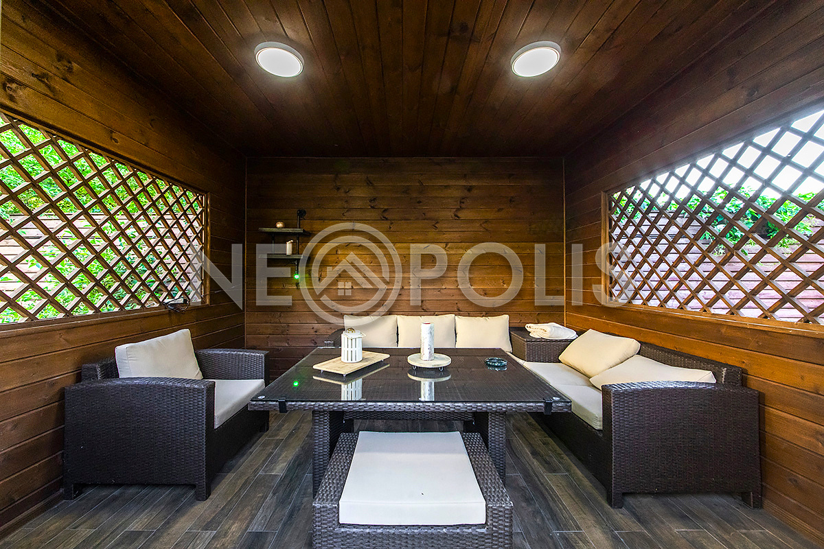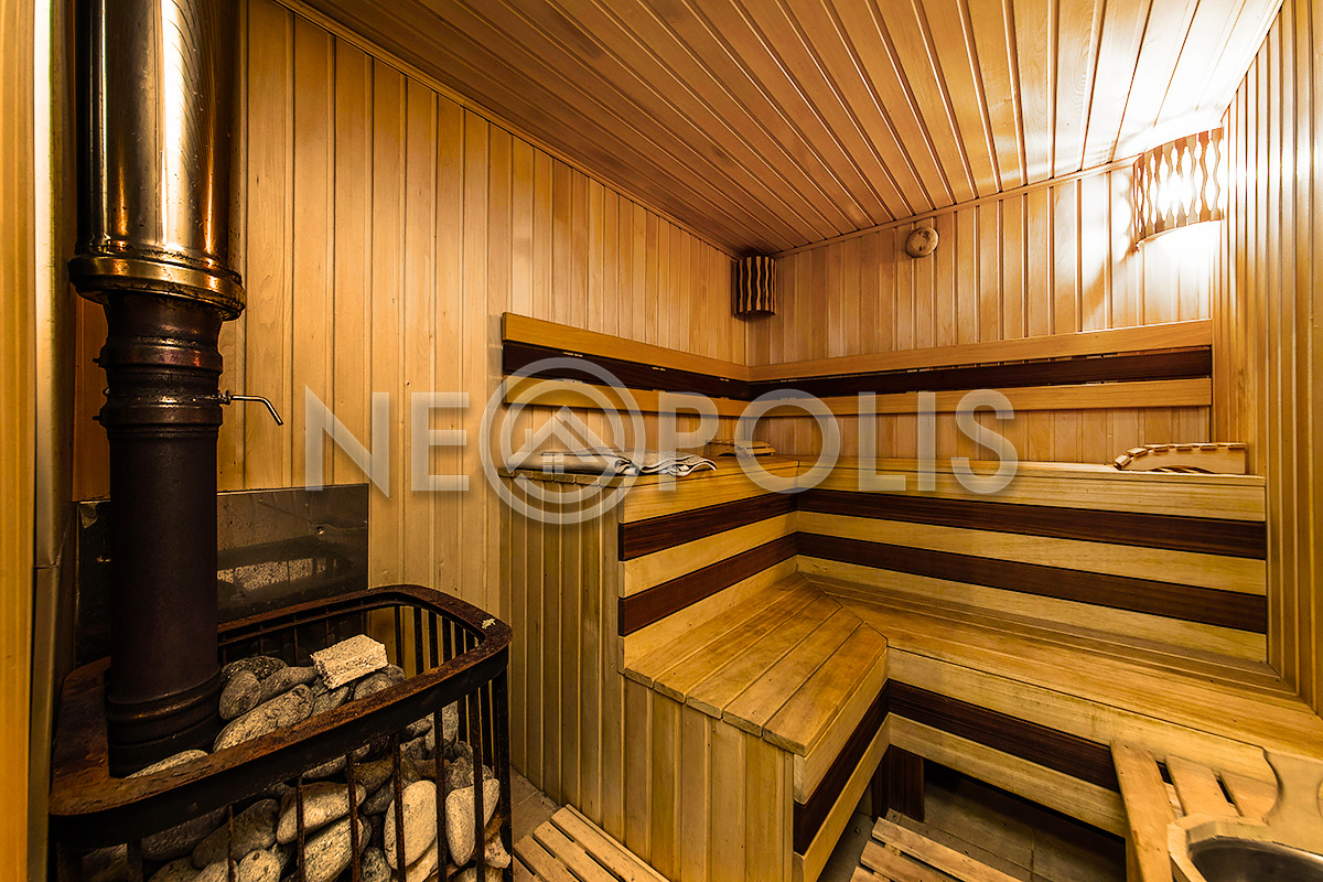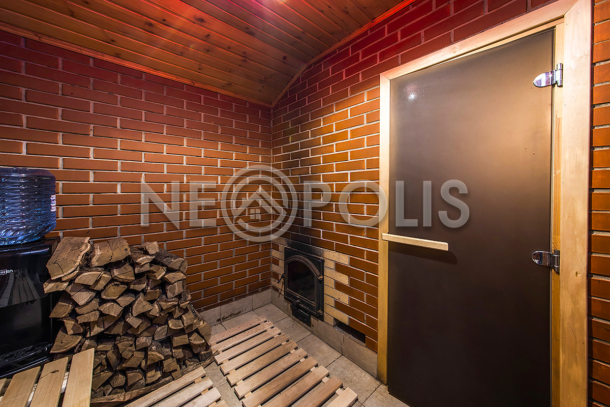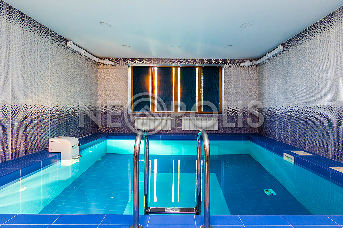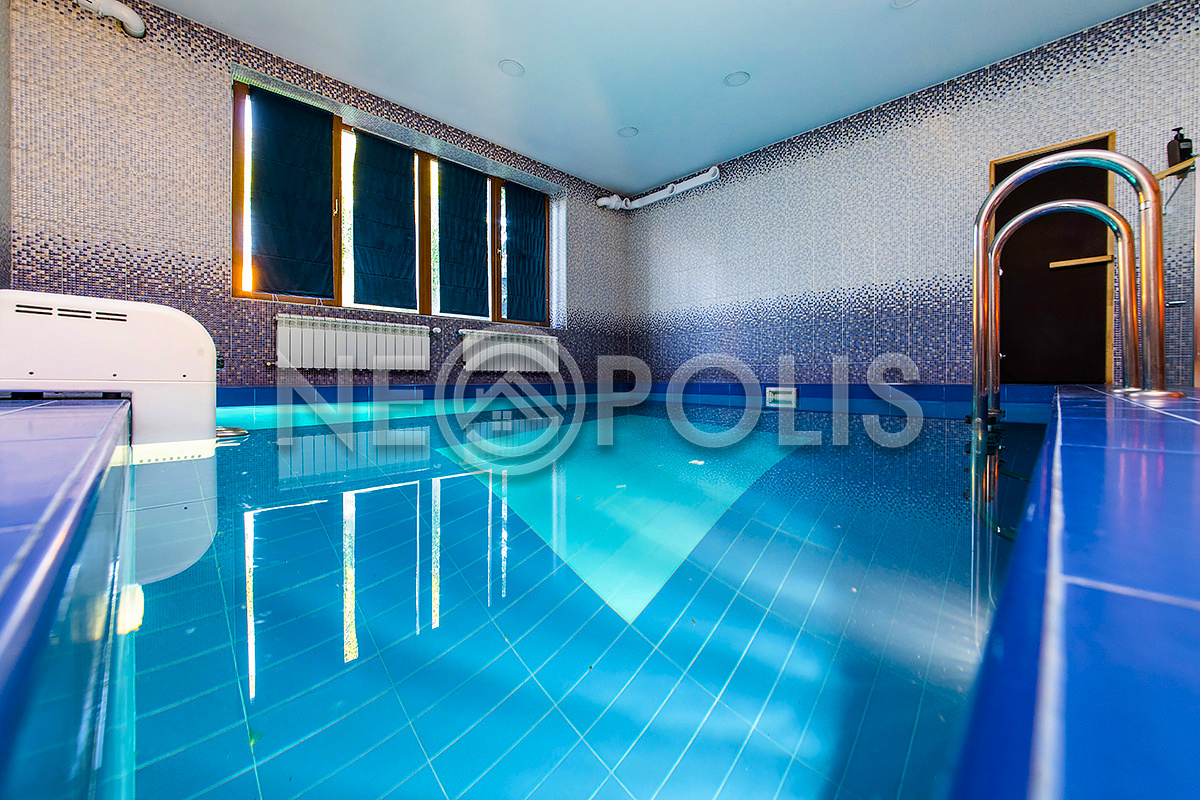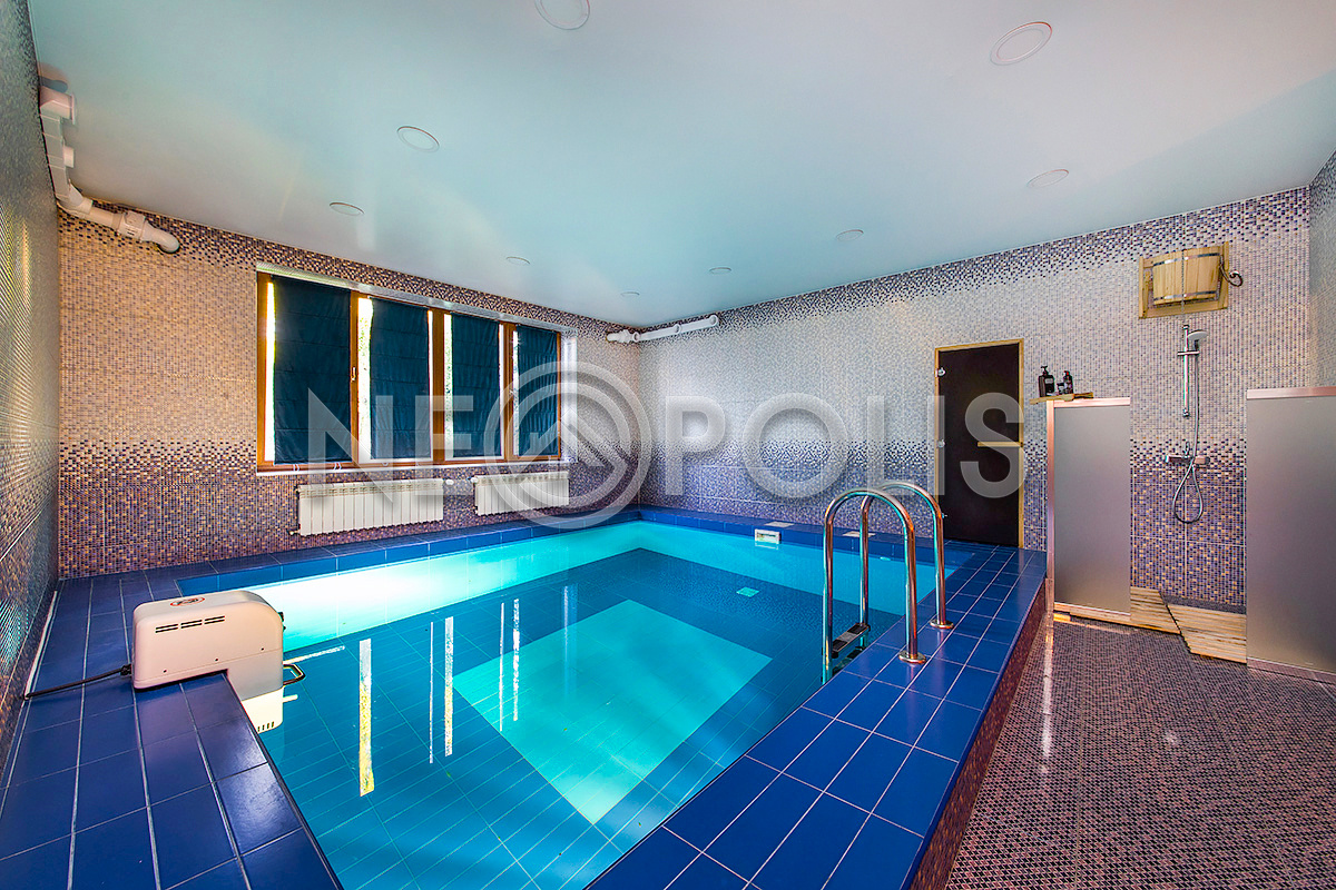 - Бассейн: 5х6м, бетонная чаша, облицована плиткой, установлена система фильтрации воды и противоток, подсветка бассейна и подогрев воды