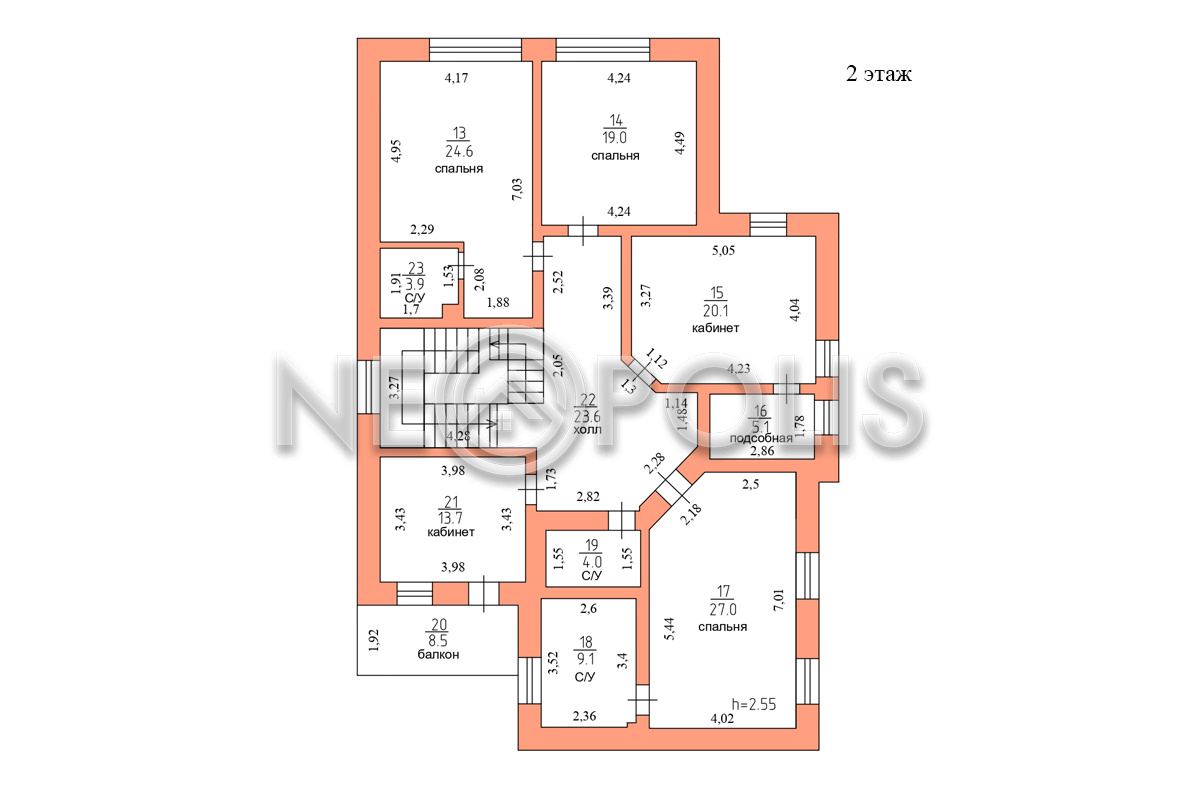 - 2 этажхолл, мастер-спальня с гардеробной и ванной комнатой, спальня с ванной комнатой, 2 спальни, кабинет с балконом, санузел, подсобная.